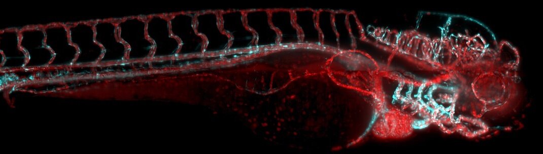 At the heart of the so called „IsoView“ light sheet microscope are four identical arms (or optical paths) arranged orthogonally to one another, each of which can simultaneously illuminate the sample and image the emitted fluorescent light. To keep crosstalk between the excitation and detection as small as possible, the optical paths are separated either temporally, spatially, or spectrally from each other. The four images generated are then combined to produce a largely isotropic image with high resolution in all dimensions. To this end, Keller and his team wrote their own implementation of the Lucy-Richardson three-dimensional multiview deconvolution algorithm. In addition to the high spatial resolution of the combined images, this approach also enables a high temporal resolution so that changes in the sample can be recorded over time.