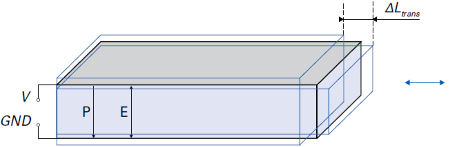 Typically, piezo contractors are flat components. Their displacement occurs perpendicularly to the polarization direction and to the electric field. The displacement of contracting actuators is based on the transverse piezoelectric effect whereby up to approx. 20 µm is nominally achieved.