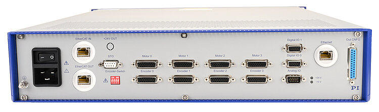 The digital inputs and outputs can be flexibly configured. For the evaluation of reference switches, digital inputs can alternatively be led to the motor connectors. Depending on the application, the inputs for the limit and reference switches can be configured for 5 V or 24 V and also as PNP or NPN inputs. Position synchronous trigger signals with up to 10 Mhz output frequency enable a precise process control at high travel velocities (position event generator – PEG).