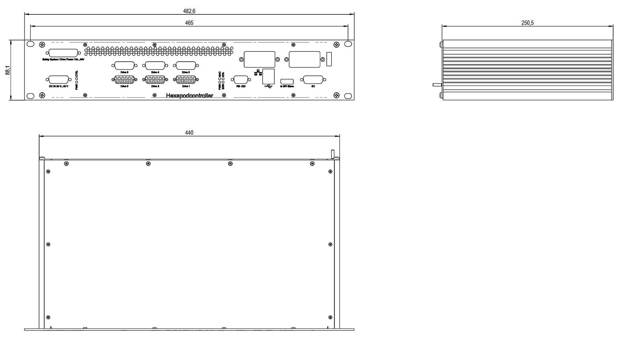 6-axis controller for hexapods, integrated drivers for BLDC motors, TCP/IP, RS-232, 19" 2 RU housing, analog inputs