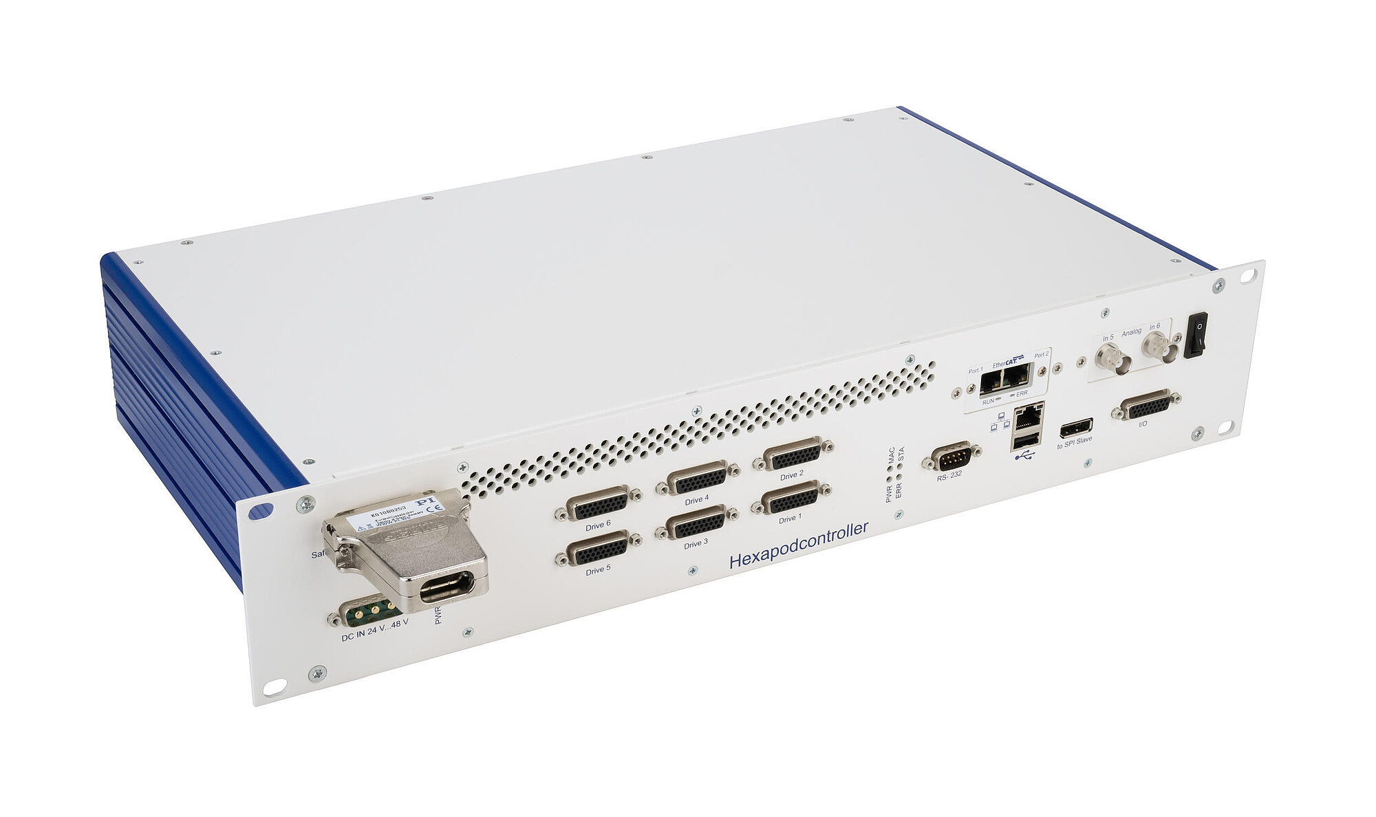6-axis controller for hexapods, integrated drivers for BLDC motors, supports STO and SS1-t safety functions, TCP/IP, RS-232, 19" 2 RU housing, analog inputs