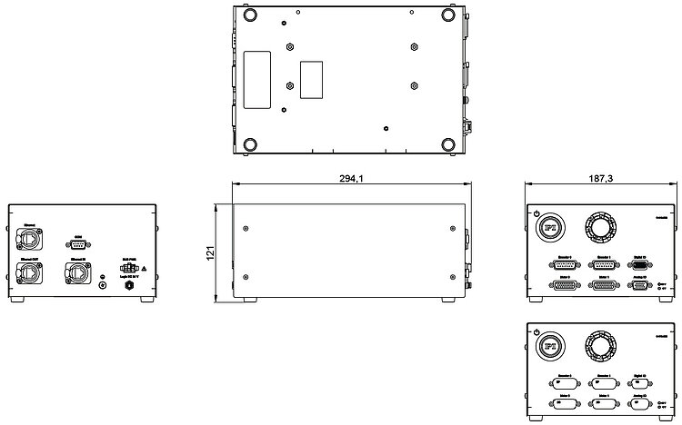 Communication interfaces | EtherCAT IN and OUT: RJ-45 Ethernet (TCP/IP, Modbus/TCP, EtherNet/IP): RJ-45 RS-232: D-sub 9 (m) |