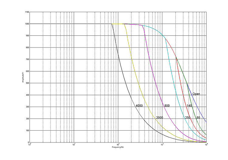 | Amplifier bandwidth, large signal | 1.4 kHz (660 nF), 350 Hz (3.4 µF) |
