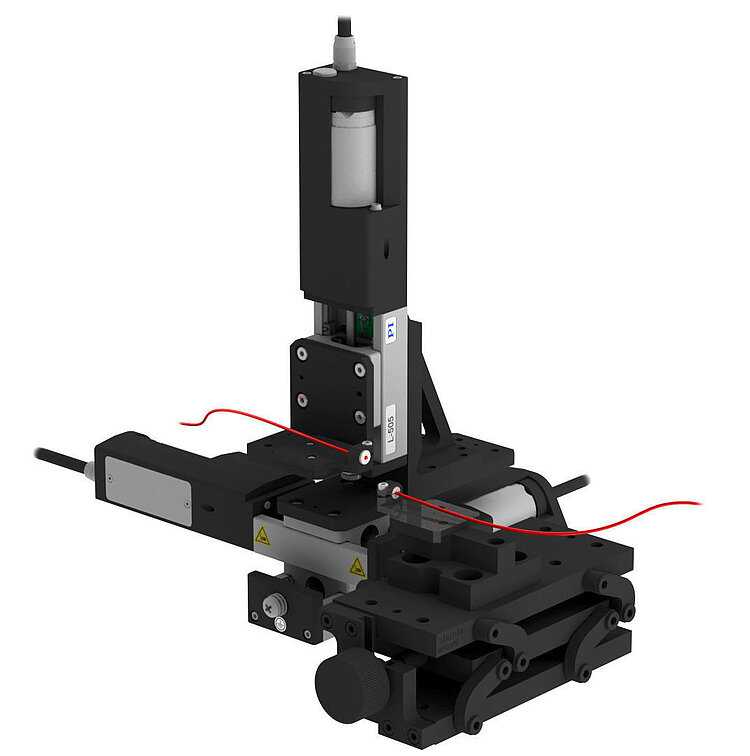Compact linear stage; 2-phase stepper motor with gearhead; 13 mm travel range; 30 N load capacity; 0.75 mm/s maximum velocity; fine-threaded spindle; 0.5 m cable length; 60 mm width, folded drivetrain