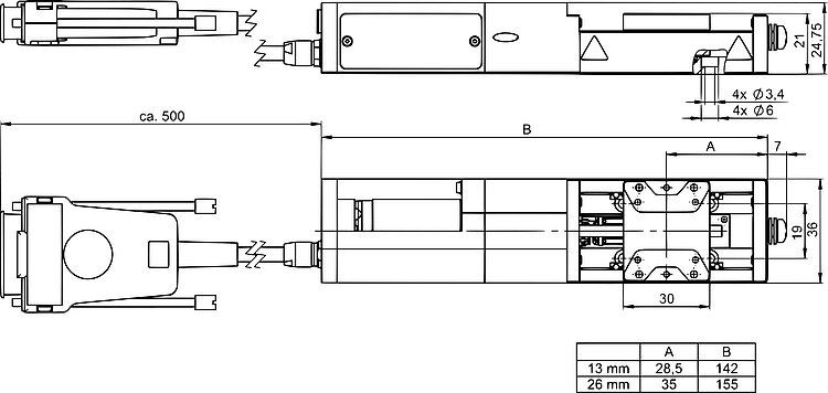 Compact linear stage; 2-phase stepper motor; 13 mm travel range; 30 N load capacity; 10 mm/s maximum velocity; fine-threaded spindle; incremental linear encoder, 5 nm sensor resolution, A/B quadrature, RS-422; 0.5 m cable length; 36 mm width