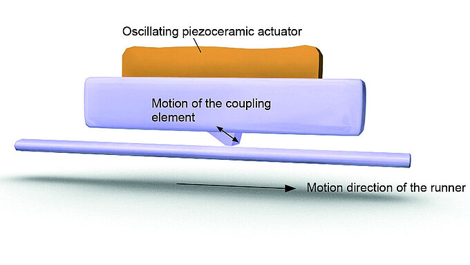 An integral part of a PILine® ultrasonic piezomotor is a piezo actuator that is preloaded against a movable, guided runner via a coupling element. The piezoceramic actuator is excited to ultrasonic oscillation by a high-frequency AC voltage between 100 and 200 kHz. Deformation of the actuator leads to periodic diagonal motion of the coupling element relative to the runner. The feed created is a few nanometers per cycle; the high frequencies lead to the high velocities. Preloading the piezoceramic actuator against the runner ensures self-locking of the drive when at rest and switched off.
