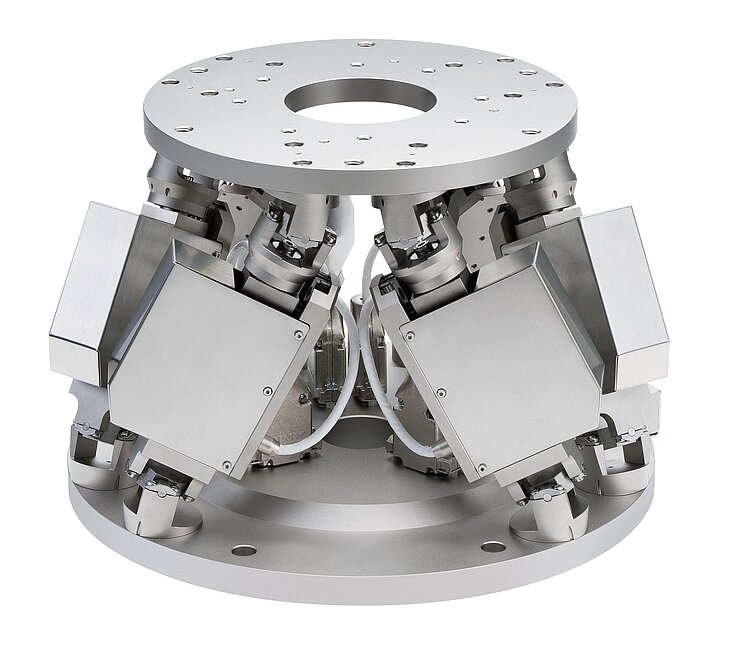 Parallel-kinematic design for 6 degrees of freedom, making it significantly more compact and stiff than serial-kinematic systems, higher dynamics, no moved cables: higher reliability, reduced friction. Compact due to folded drive design. Suitable for vacuum environments to 10-6 hPa.