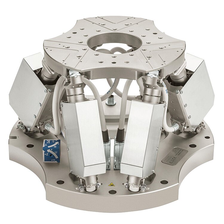 Parallel-kinematic design for 6 degrees of freedom, making it significantly more compact and stiff than serial-kinematic systems, higher dynamics, no moved cables: Higher reliability, reduced friction.