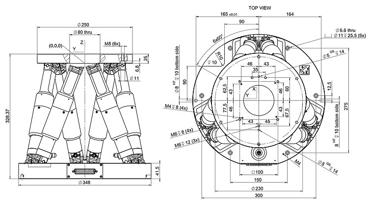Precision Hexapod; DC gear motor; rotary encoder; 80 kg payload; 0.15 mm/s maximum velocity; vacuum compatible to 10-6 hPa; cable set 2 m vacuum side; feedthrough. Air side connecting cables are not included in the scope of delivery and must be ordered separately.