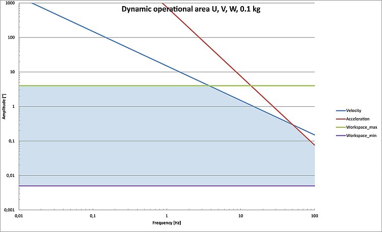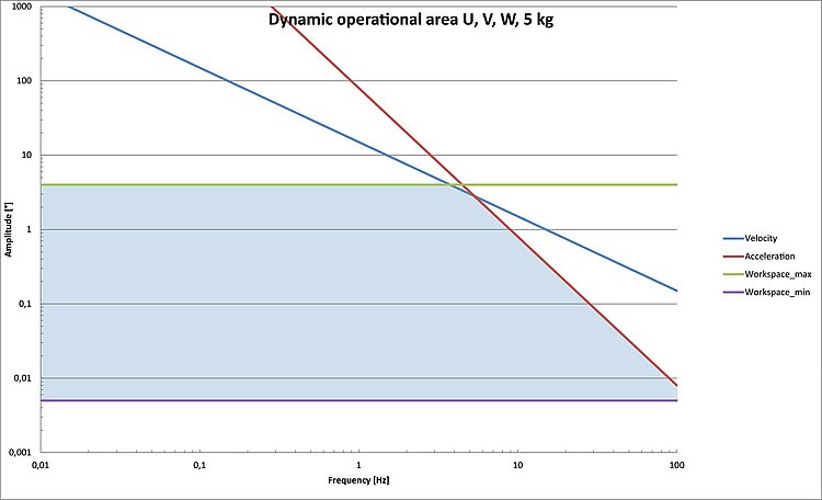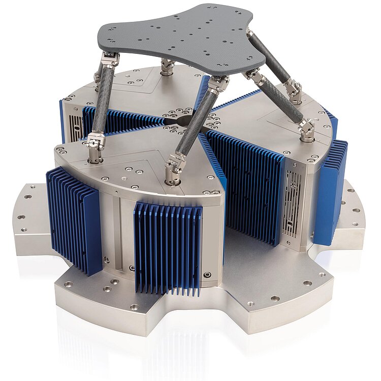 High-dynamics motion hexapod; voice coil drive; 1 kg payload; 250 mm/s maximum velocity; flexures; high-performance power adapter; 3 m cable set