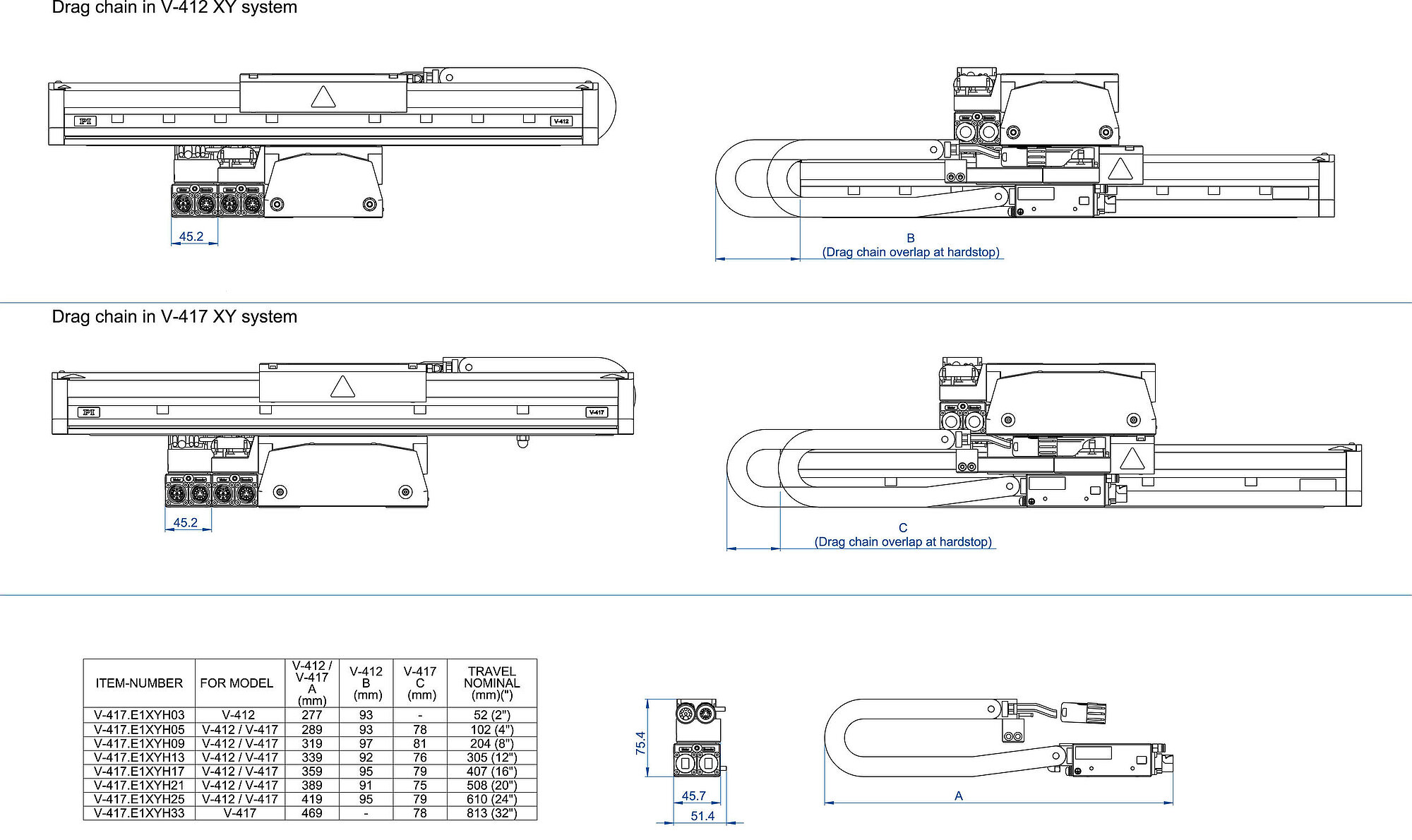 Regardless of the travel range of the Y axis, the V-417.E1XYH drag chain must be selected for the travel range of the X axis.