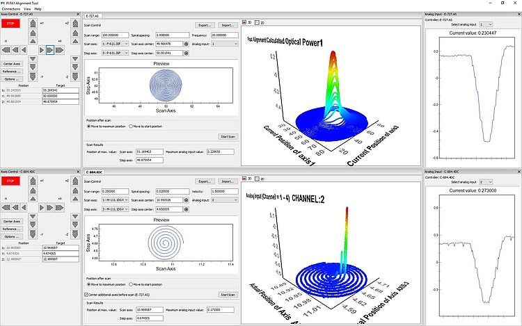 Ideally adapted to the requirements for the interactive alignment of optoelectronic components: Graphical representation of defined area scans and scan results. Monitoring the measured intensity signal. Saving and loading settings.