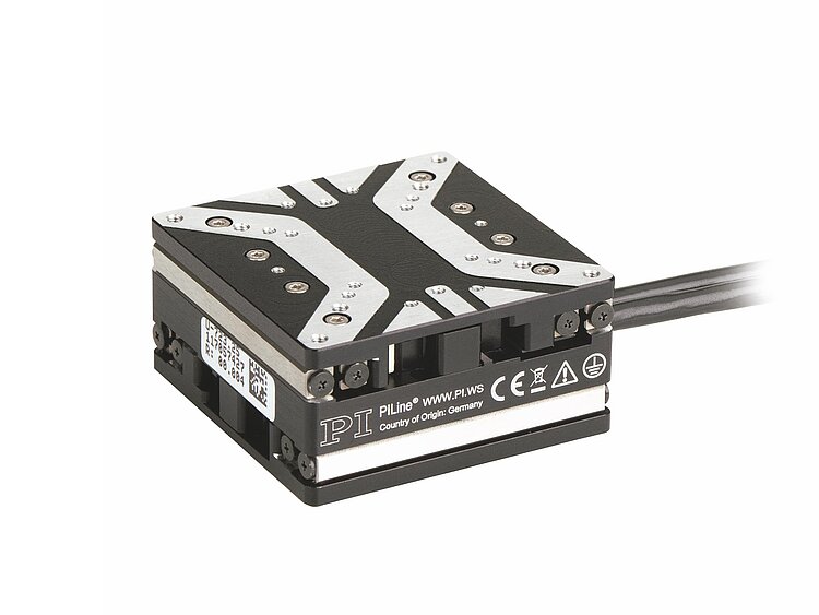 PILine® XY stage; PILine® piezo motor, performance class 1; 22 mm × 22 mm travel range (X × Y); 5 N load capacity; 200 mm/s × 200 mm/s maximum velocity; 2 N drive force; incremental linear encoder; 10 nm sensor resolution; 1.5 m cable length